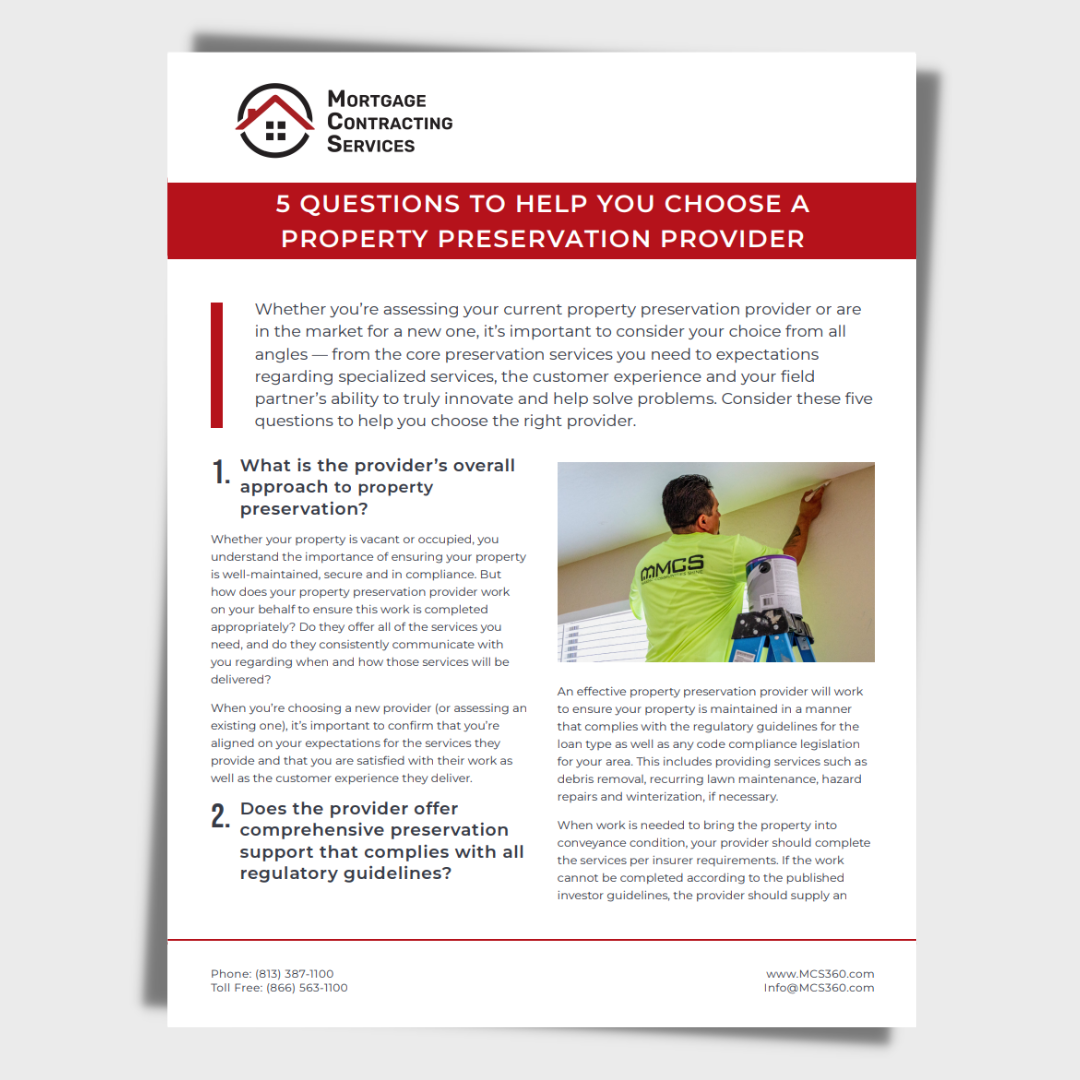 The longer a property remains on the market, the more important REO property maintenance becomes. Mortgage Contracting Services, a leading REO asset management company, works with our clients to provide the necessary property preservation and inspection services to help mitigate the risk of holding properties and reduce holding timelines.